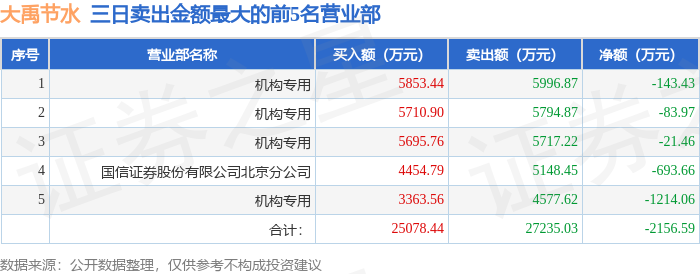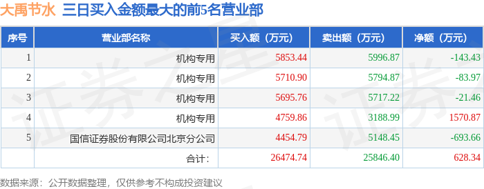 大庆股票配资 7月23日大禹节水(300021)龙虎榜数据: 机构净买入107.94万元(3日)